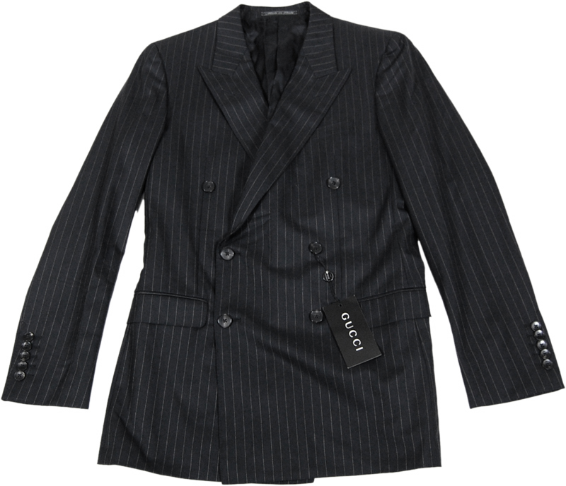 トムフォード期グッチのダブルジャケットです。大きめのピークドラペル、シェイプの効いたシルエット、袖の5ボタン、トムフォードのこだわりを感じる非常に美しいジャケットです。