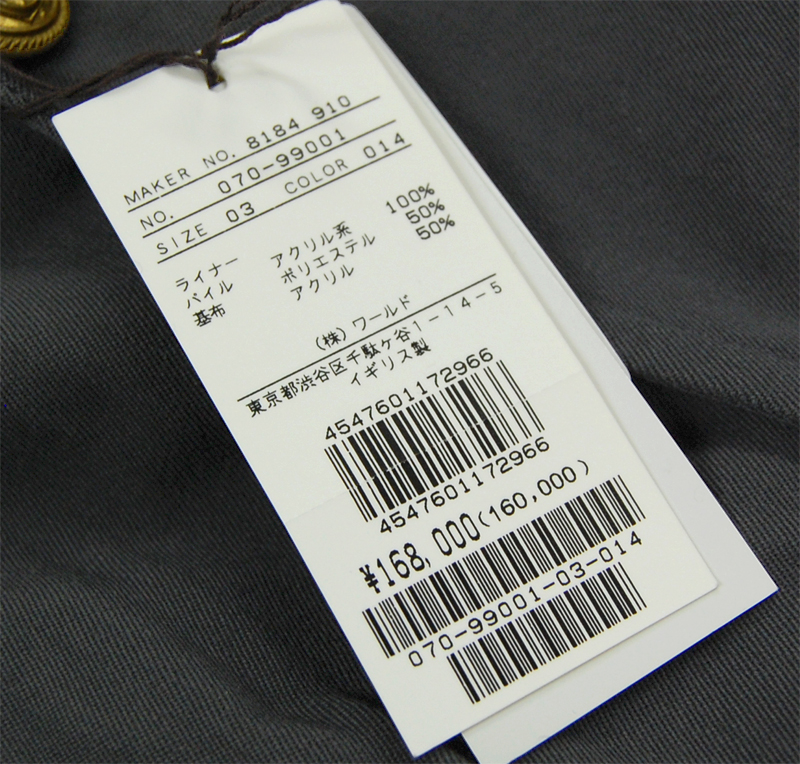 素材:表生地:毛70%、綿30% 裏生地:胴部分 綿100%、袖部分 ポリエステル100% ライナー:パイル アクリル系100%、基布 ポリエステル50%、アクリル50%