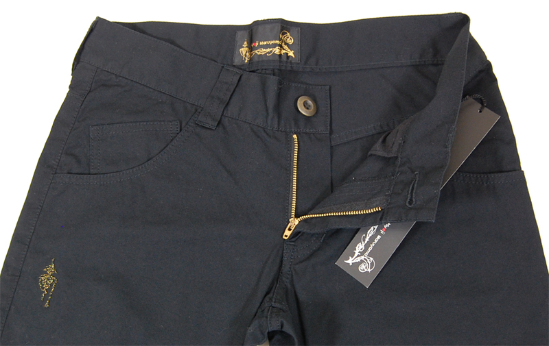 プロポーションがきれいなシンプルな黒の綿パンツ。立体裁断による洗練されたシルエットと履き心地は抜群です。バックスタイルは右側にフラップ付きのポケット、左側はポケットのステッチを延長させたデザインになっています。