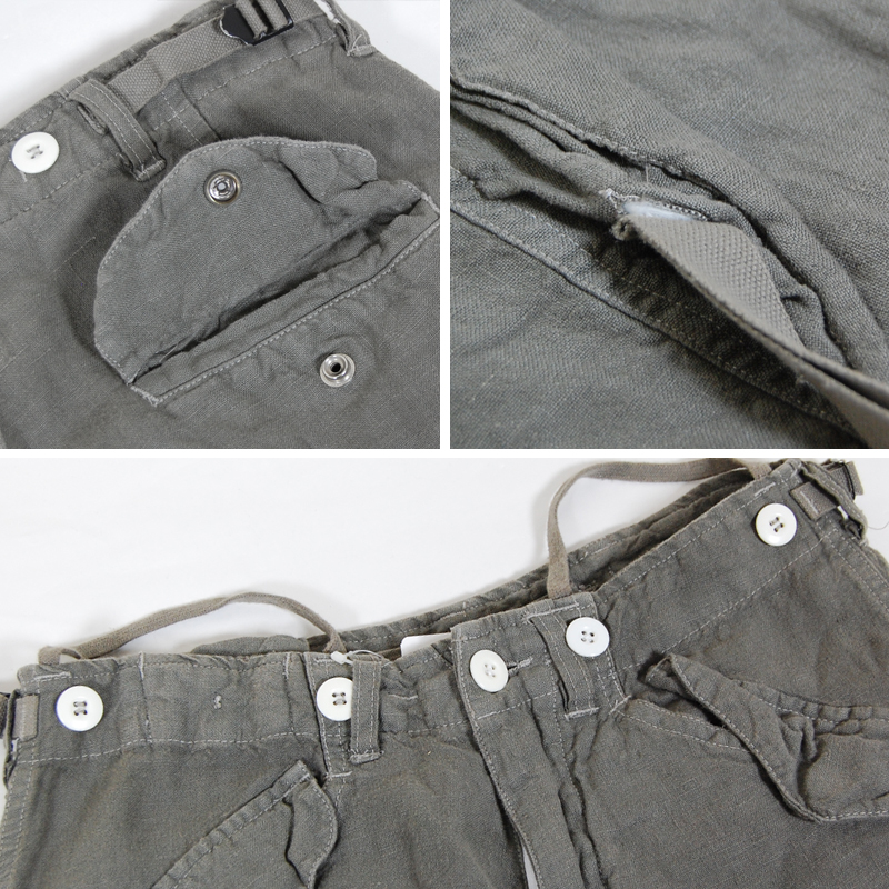 ヘンプ(麻)のハーフカーゴパンツです。夏にぴったりの涼しげな素材感、綺麗な色ですので、白のTシャツや麻シャツと合わせて頂くとよろしいかと思います。履き込むと当たりや色落ちで出てきて、いい味が出てきます。ウエストにはドローコードが入っています。腿ポケットのロープはポケットの中に収納できます。 カラーも豊富に販売しております。 こちらは写真1枚目、2枚目の色です。中国製