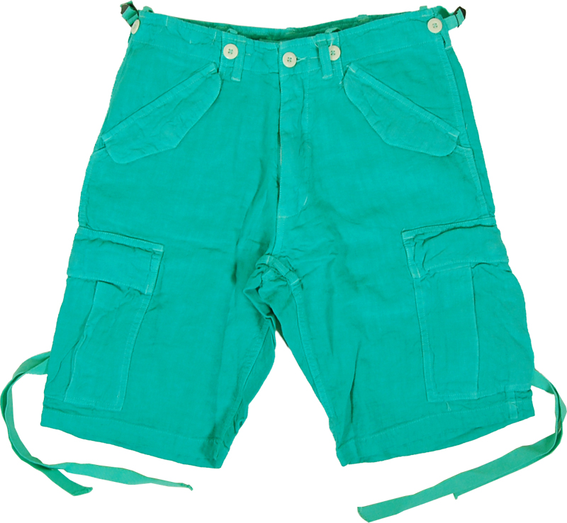 ヘンプ(麻)のハーフカーゴパンツです。夏にぴったりの涼しげな素材感、綺麗な色ですので、白のTシャツや麻シャツと合わせて頂くとよろしいかと思います。履き込むと当たりや色落ちで出てきて、いい味が出てきます。ウエストにはドローコードが入っています。腿ポケットのロープはポケットの中に収納できます。 カラーも豊富に販売しております。 こちらは写真1枚目、2枚目の色です。中国製