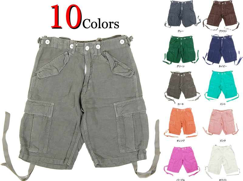 ヘンプ(麻)のハーフカーゴパンツです。夏にぴったりの涼しげな素材感、綺麗な色ですので、白のTシャツや麻シャツと合わせて頂くとよろしいかと思います。履き込むと当たりや色落ちで出てきて、いい味が出てきます。ウエストにはドローコードが入っています。腿ポケットのロープはポケットの中に収納できます。 カラーも豊富に販売しております。 こちらは写真1枚目、2枚目の色です。中国製