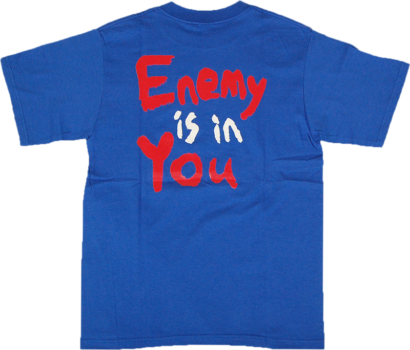 ブルーに手書きプリントが入ったTシャツです。前面に「Fight」、背面に「Enemy is in you」のメッセージが入っています。アメリカ製です。
