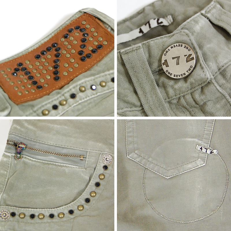 172のカーキデニムです。スタッズで装飾された人気の高いモデルです。膝部分をしぼって見せる172独特のカッティングは、抜群の美脚シルエットと履き心地の良さを生み出します。