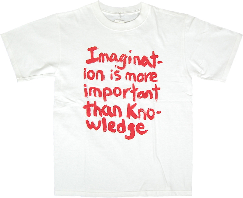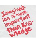 白にピンクの手書きプリントが入ったTシャツです。「Imagination is more important than Knowledge.」のメッセージプリントが入っています。アメリカ製です。