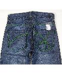 ヒップポケットのロゴステッチや太めのステッチがリハッシュらしいお洒落なデニムです。グリーンのステッチが印象的です。イタリア製です。