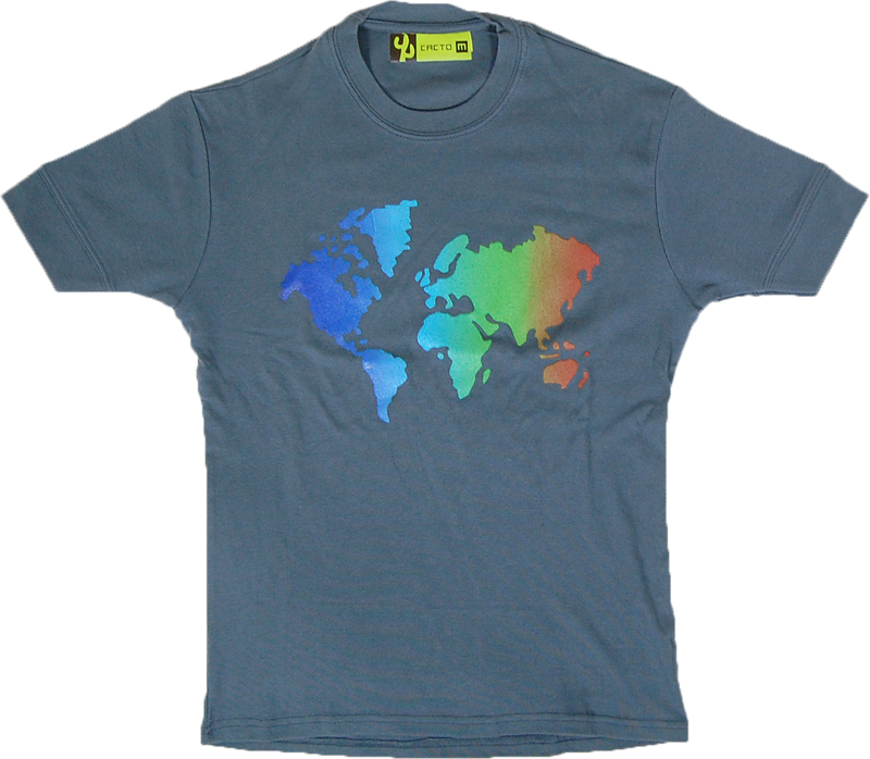 グラデーションカラーの世界地図がプリントされたTシャツです。MOULANTのモデル名の通り、ポリエステル混のそそ財を使った体にフィットするデザインです。スペイン製です。