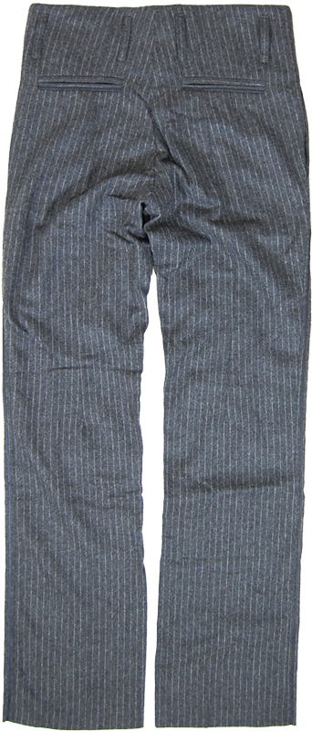 ストライプのスラックスです。腰回りに切り返しのないデザインで、ボタンホックのステッチが印象的です。シンプルできれいなシルエットです。側章が入っています。イタリア製です。