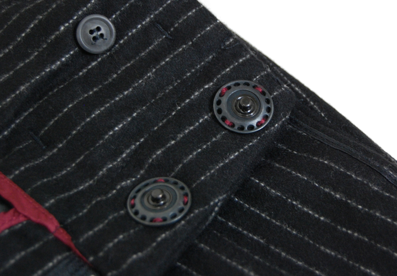 ストライプのスラックスです。腰回りに切り返しのないデザインで、ボタンホックのステッチが印象的です。シンプルできれいなシルエットです。側章が入っています。イタリア製です。
