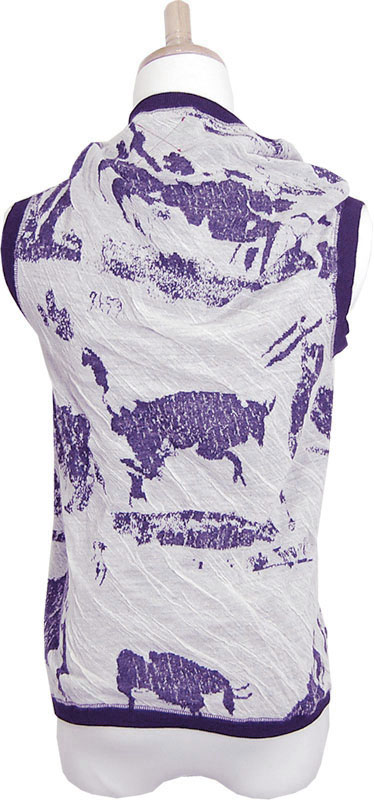 A.T.SHIRTのダブルジップノースリーブニットです。壁画風の柄ですが、見てもどのように出来ているのかわからないくらい、非常に凝った加工です。白い部分は紫の生地と白の生地が2重になっており、紫に見える部分で縫い合わせてあるようです。 首元にたるみ感が出ます。ダブルジップでニュアンスを変えてお使いください。 イタリア製です。 ジッパーの開け閉めが多少しづらいです。