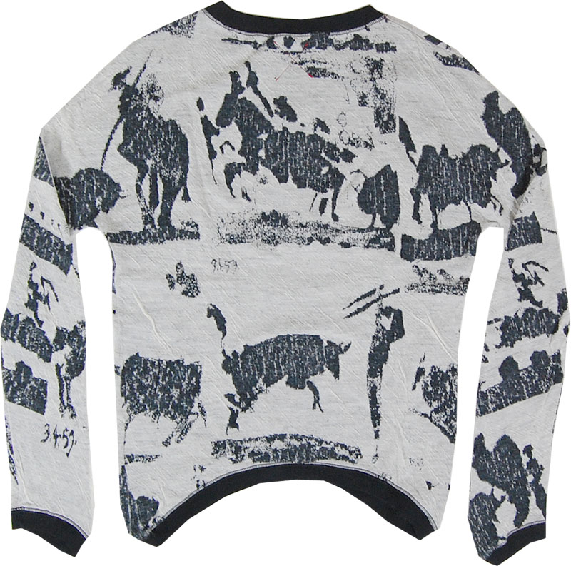 A.T.SHIRTのデザインセーターです。壁画風の柄ですが、見てもどのように出来ているのかわからないくらい、非常に凝った加工です。白い部分はグレーの生地と白の生地が2重になっており、グレーに見える部分で縫い合わせてあるようです。