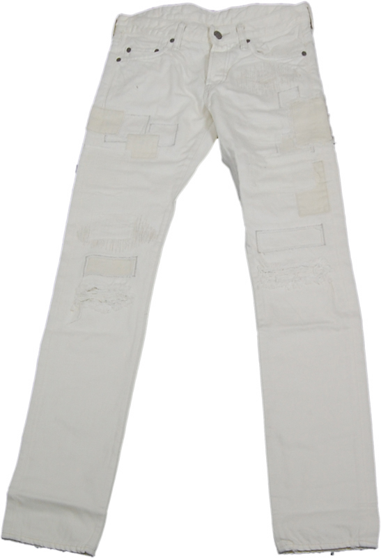 ヒステリックグラマーのホワイトデニムです。クラッシュ、パッチ加工等の凝ったデザインが格好いいです。