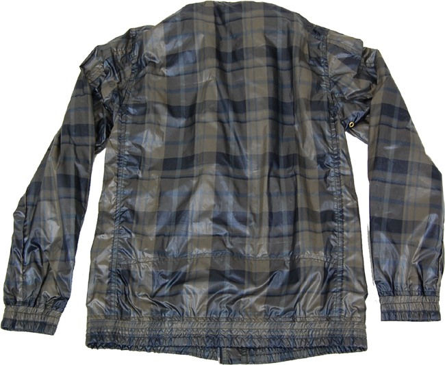 ライダースのデザインを取り入れた、カーキチェックのナイロンパーカーです。襟にはフードが収納されています。