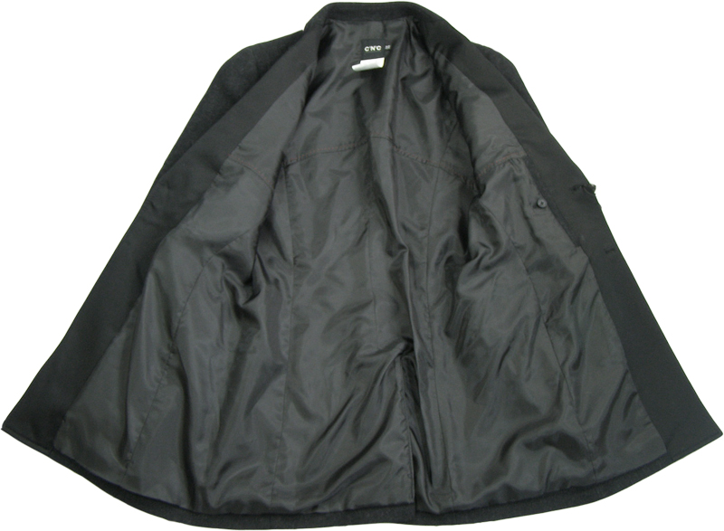 グレーのタキシードディテールのコートです。霜降りの生地やジッパー付きの胸ポケットがドレッシーになりすぎないCNCらしいカジュアル感を出しています。
