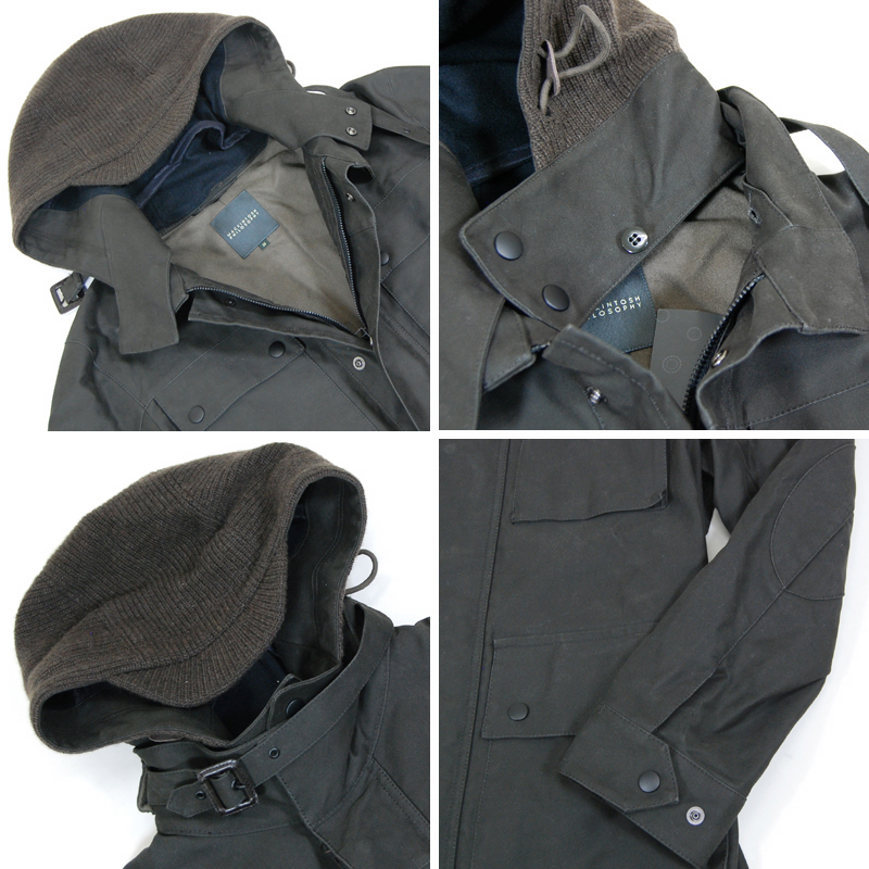 カーキのマウンテンパーカーです。フロントはジッパーとボタンホックのダブル、つば付きのニットフードがついています。フードは取り外し可能です。実用にもカジュアルにも使いやすいジャケットです。