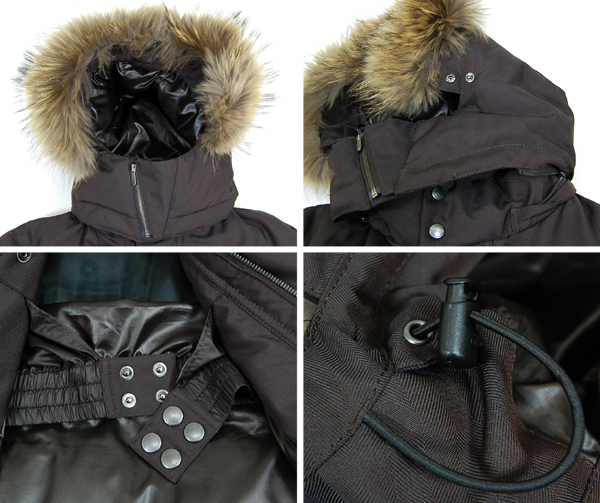 素材:表:ポエリエステル100% リブ:アクリル70%、毛30% フード部分:タヌキ パイピング部分:牛革 中綿:ダウン80%、フェザー20% 裏地 胴上、胴下、袖、フード:ポリエステル