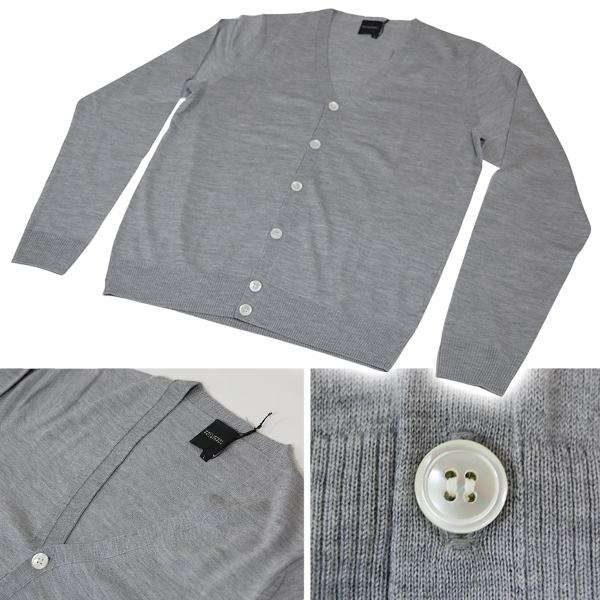 グレーのシルク混カーディガンです。上質な素材の定番デザインですので、重宝して頂けると思います。
