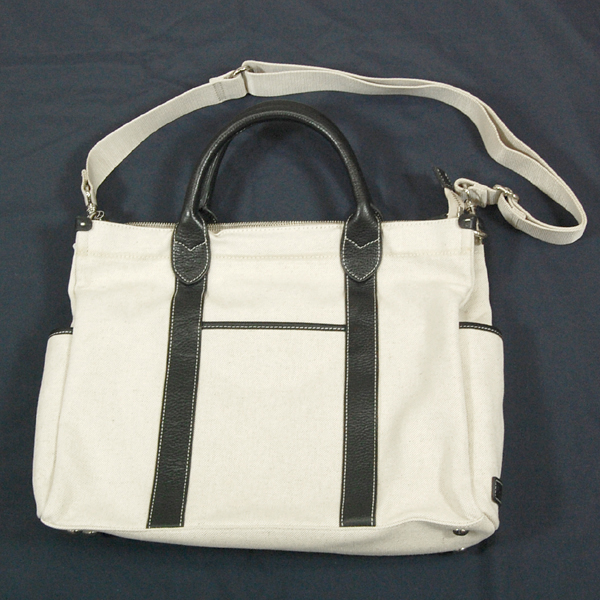 使いやすいキャンバス素材の2WAYビジネスバッグです。裏地は ブルーのストライプですので、開けたときにさわやかです。両サイドにポケット、持ち手からのびるラインの間にもポケットがあります。2WAYでお使いいただける機能的なバッグです。 定価24150円です。多少の汚れ、擦れがある場合がございますので、ご了承ください。