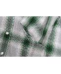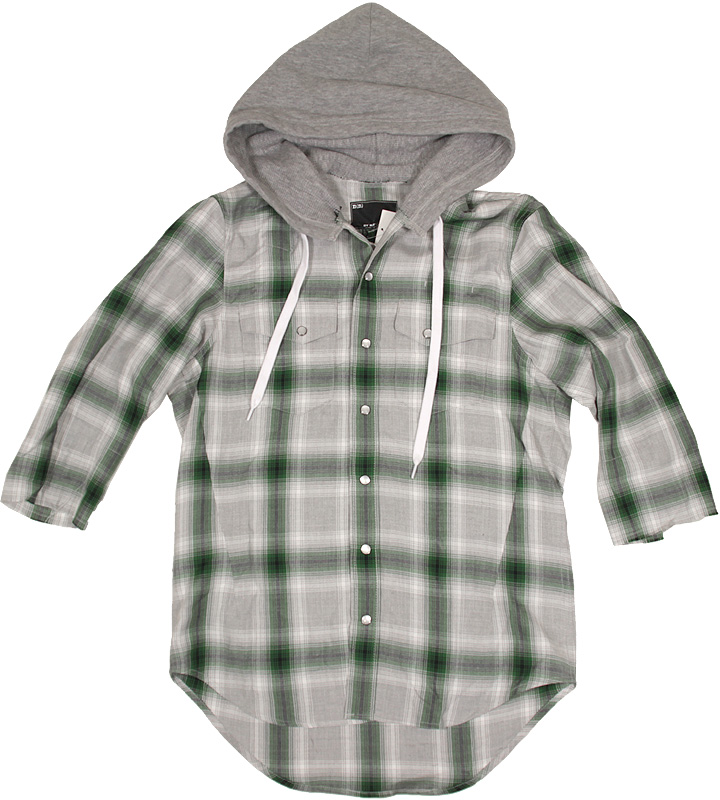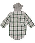 フード付きのチェック柄シャツです。7分袖、袖口は切りっぱなし。ボタンホックにウエスタンデザインの使いやすいシャツです。