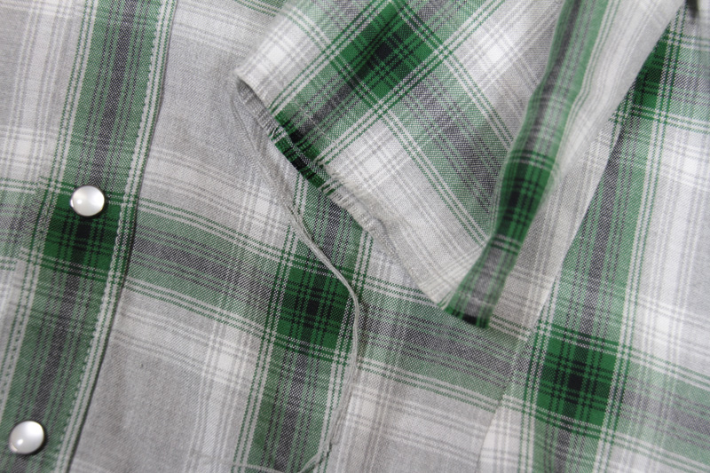 フード付きのチェック柄シャツです。7分袖、袖口は切りっぱなし。ボタンホックにウエスタンデザインの使いやすいシャツです。