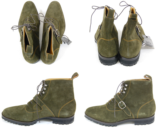 カーキのベルト付きレースアップブーツです。日本製ですので、非常に丁寧でしっかりとした作りです。ステッチのラインもお洒落です。 スウェード素材のため多少の擦れがございます。ご了承ください。 定価37800円です。