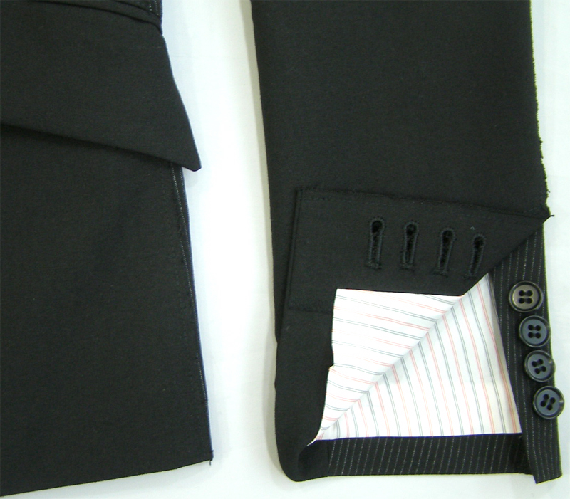 前合わせから裾、袖の裏側、脇部分をストライプ生地に切り返したデザインのジャケットです。形はピークドラペル、2ボタン、センターベントです。