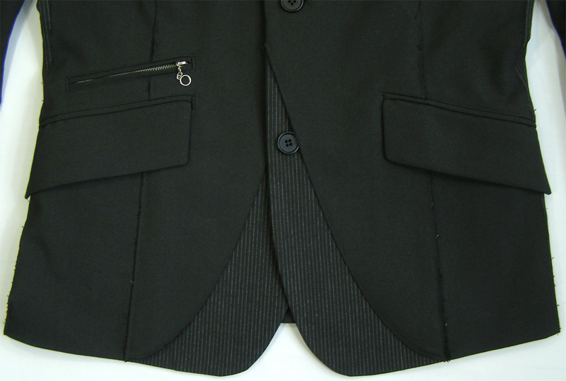 前合わせから裾、袖の裏側、脇部分をストライプ生地に切り返したデザインのジャケットです。形はピークドラペル、2ボタン、センターベントです。