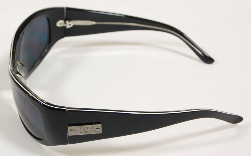 エポカウォモのサングラスです。セルフレームのシンプルなデザインに白のラインが全体を引き締めています。テンプルにはロゴプレートがついています。