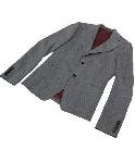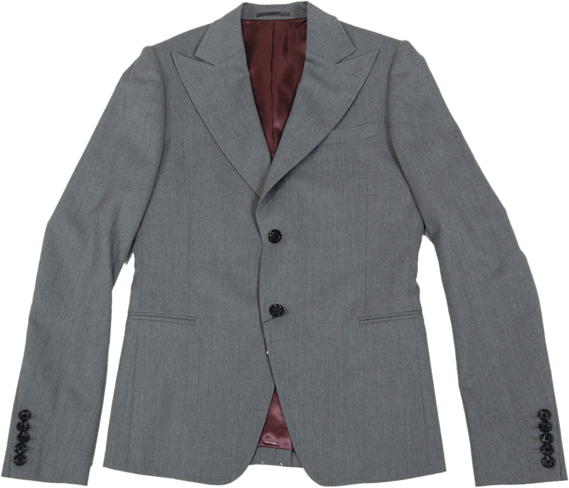 ガアラベンドのグレージャケットです。形は、二つボタン、センターベントです。なんと言っても目を惹くのは大きなピークドラペル。ややショート丈のきれいなシルエットです。ワインレッドの裏地もきれいです。