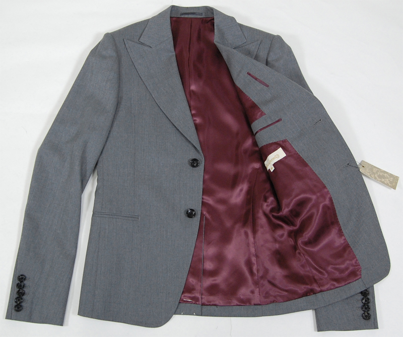 ガアラベンドのグレージャケットです。形は、二つボタン、センターベントです。なんと言っても目を惹くのは大きなピークドラペル。ややショート丈のきれいなシルエットです。ワインレッドの裏地もきれいです。