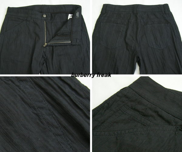 イタリア製の上質な生地を使用したしわ加工パンツです。よく見ると何種類かの織り方で織られた非常に凝った生地です。やや太めの夏らしいシルエットです。新品ですが、展示品で時間が経っておりますので、ジッパー部に多少のさびがある場合がございます。