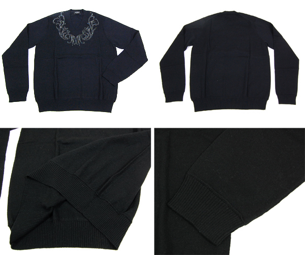 Vネックの周りにメタルスタッズで装飾したエポカらしい豪華なニットです。ジャケットのインナーに着て頂くと胸元の装飾が見え大変お洒落です。裾と袖はリブになっています。