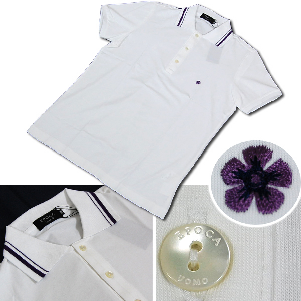 襟には紺のライン、胸にワンポイント、フラワーの刺繍が入っています。