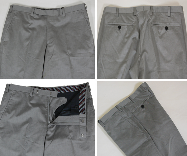 一本持っていると使いやすいグレーのパンツです。綿とポリエステルの混紡ですので、やや光沢感があり上品な印象ですので、シャツやジャケットと合わせて着て頂くとかっこいいと思います。