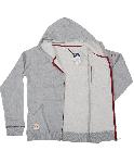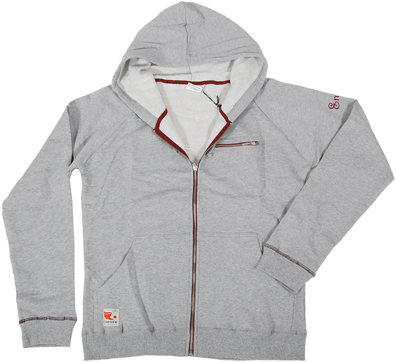 使いやすいグレーのジップパーカーです。ジッパーや袖口のえんじのラインがアクセントになっています。ポルトガル製です。