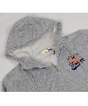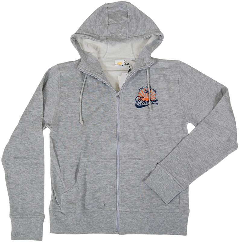 グレーのスウェットパーカーです。裏側は起毛素材で肌触りがいいです。水着の上に羽織って頂いてもいいですし、街着としてもお使い頂けます。胸に太陽をモチーフにしたマークがプリントされています。ポルトガル製です。