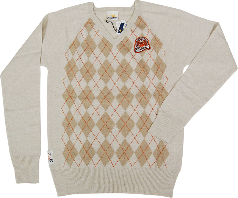 ベージュのアーガイル柄セーターです。胸にワッペンが付いています。LANEROSSI社製の上質なメリノウールを使用しています。イタリア製です。