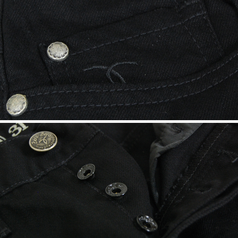 コンストラクションゼロのスリムパンツです。細身のシルエットですので、使いやすいです。シルエットはもちろんですが、リベットや石入りの飾り等、ディテールへのこだわりはさすがで、こういった部分が他のデニムブランドとは見た目にも一線を画す仕上がりとなっています。