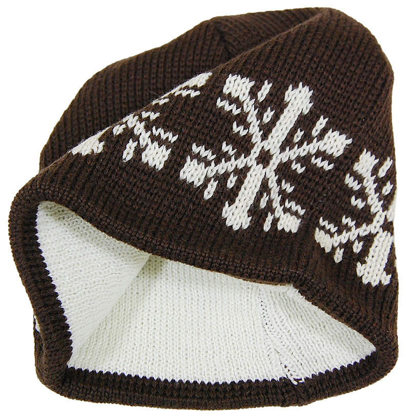焦げ茶に雪柄のニット帽です。定番デザインですので、長くご愛用頂けると思います。