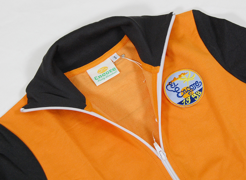 お洒落なジップアップスウェットです。オレンジと焦げ茶のコンビカラーに白のジッパーラインがきれいな組み合わせです。胸にワッペンが付いています。伸縮性があるので、タイトに着て下さい。(伸縮性があるため採寸には多少の差があります。)ポルトガル製です。
