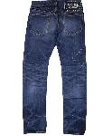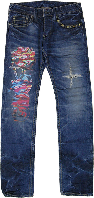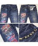 モークスのハイビスカルペインとデニムです。 左ポケットにはメタルスタッズ、左にはクロスのクラッシュ加工、右にはハイビスカル、LOVE、ロゴを組み合わせたペイント加工が入っています。