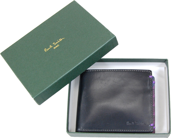 黒レザーの外側にプリントの内側の人気シリーズです。グラデーションの幾何学模様がプリントされたポールスミスらしい遊び心のあるデザインです。開いたときに目を引くお洒落な財布です。