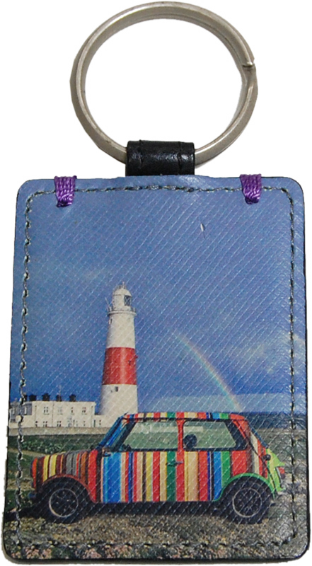 人気のマルチストライプminiクーパーのキーリングです。表はロゴが刻印されただけのシプルなデザイン、裏はミニがプリントされた型押しレザーです。