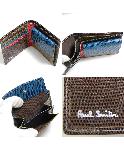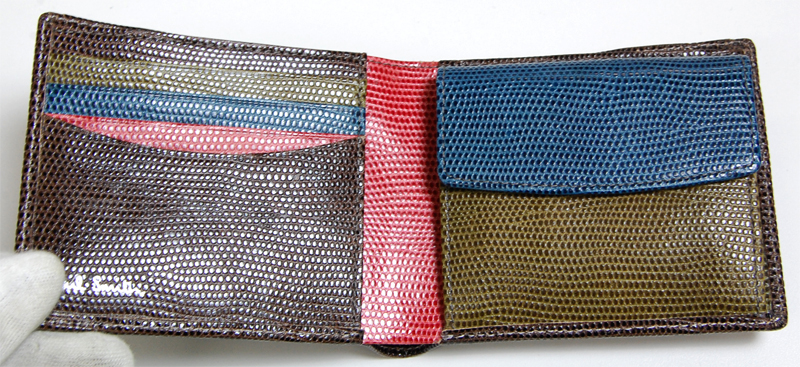 リザード型押し2折財布です。外側はワンポイントメタルのPSがついただけのシンプルなデザイン。内側はマルチカラーのポールスミスらしい配色の財布です。