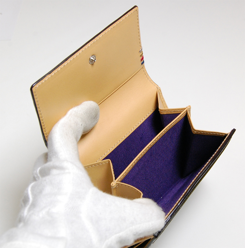 マルチステッチの2折財布です。木目のようなレザーに4色のステッチが入っています。内側はベージュで、裏地にはパープルの生地が使われています。