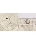 麻混パンツです。麻混の生地に、ややゆったりとしたシルエットの夏らしい涼しげなパンツです。白のポロシャツや、Tシャツ、サンダルと合わせてさらっと着て頂くと格好いいです。フラップ付きのヒップポケットにはおなじみのステッチが入っています。イタリア製です。