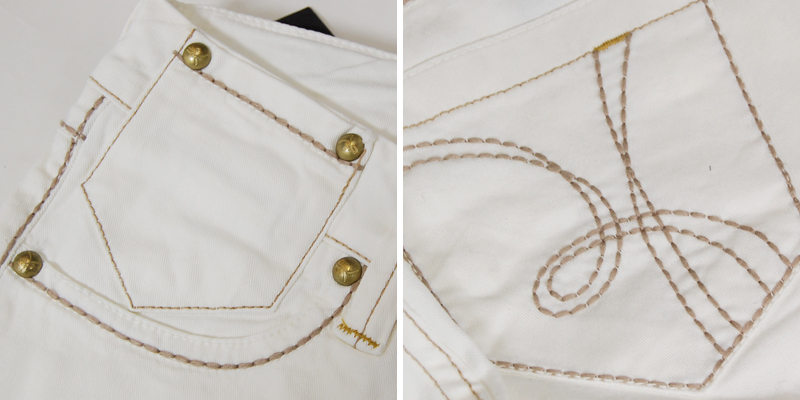 リハッシュのスキニーデニムです。ストレッチが効いていますので履きやすいです。白ですので、着用に問題がない程度の若干の汚れがある場合がございます。イタリア製です。