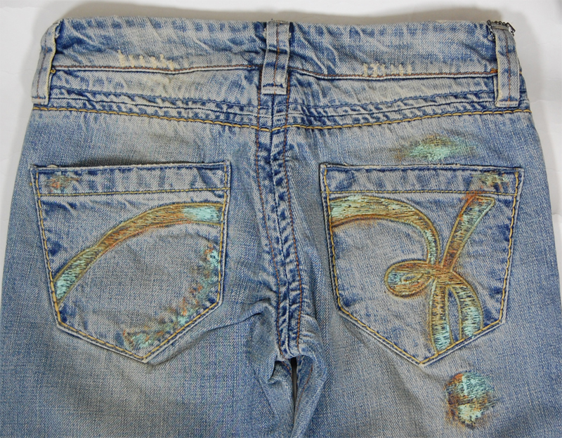 ややブーツカット気味のデニムです。クラッシュ加工に刺繍をし、その上にペイント加工がされた手の込んだデニムです。加工には個体差がございますので、ご了承ください。イタリア製です。