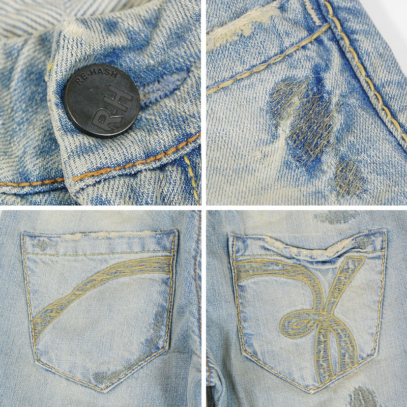 リハッシュの特徴的な太めのステッチ、ヒップポケットにロゴをあしらったデザインです。太いステッチやロゴ部分には毛皮のような糸が使われています。イタリア製です。