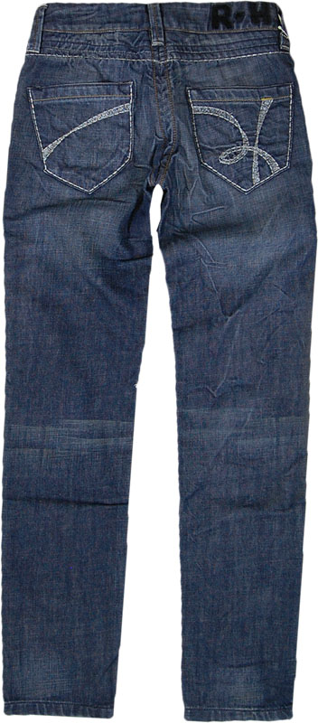 ヒップポケットのロゴや太めのステッチがリハッシュらしいお洒落なデニムです。テーパードのきれいなシルエット。ヒップのロゴはシルバーの糸で刺繍されています。R-H部分はレザーです。イタリア製です。